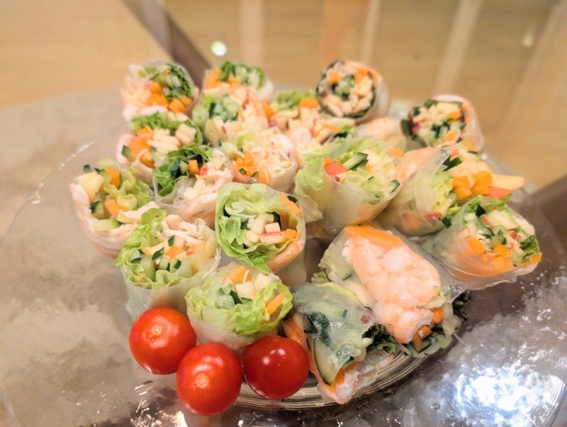 ライスペーパーで巻く作業は少しコツがいりますが、きれいに巻けると達成感がありますね!ギュッときつく巻いていきます。