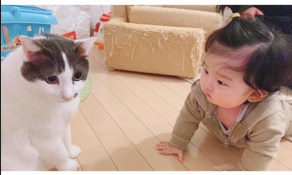 「あと10cmでどうなる?猫と孫の緊張の瞬間」